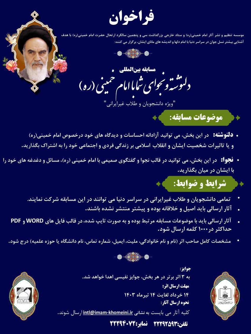 Poziv na medijsku kampanju "Glas potlačenih, odjeci globalnog otpora protiv zločina cionizma" kao i takmičenje "Vaše bilješke i šaputanja sa Imamom Homeinijem (r.a.)" u organizaciji Instituta za uređivanje i objavljivanje djela hazreti Imama Homeinija (r.a). Rok za predaju radova je 21. juli 2024.