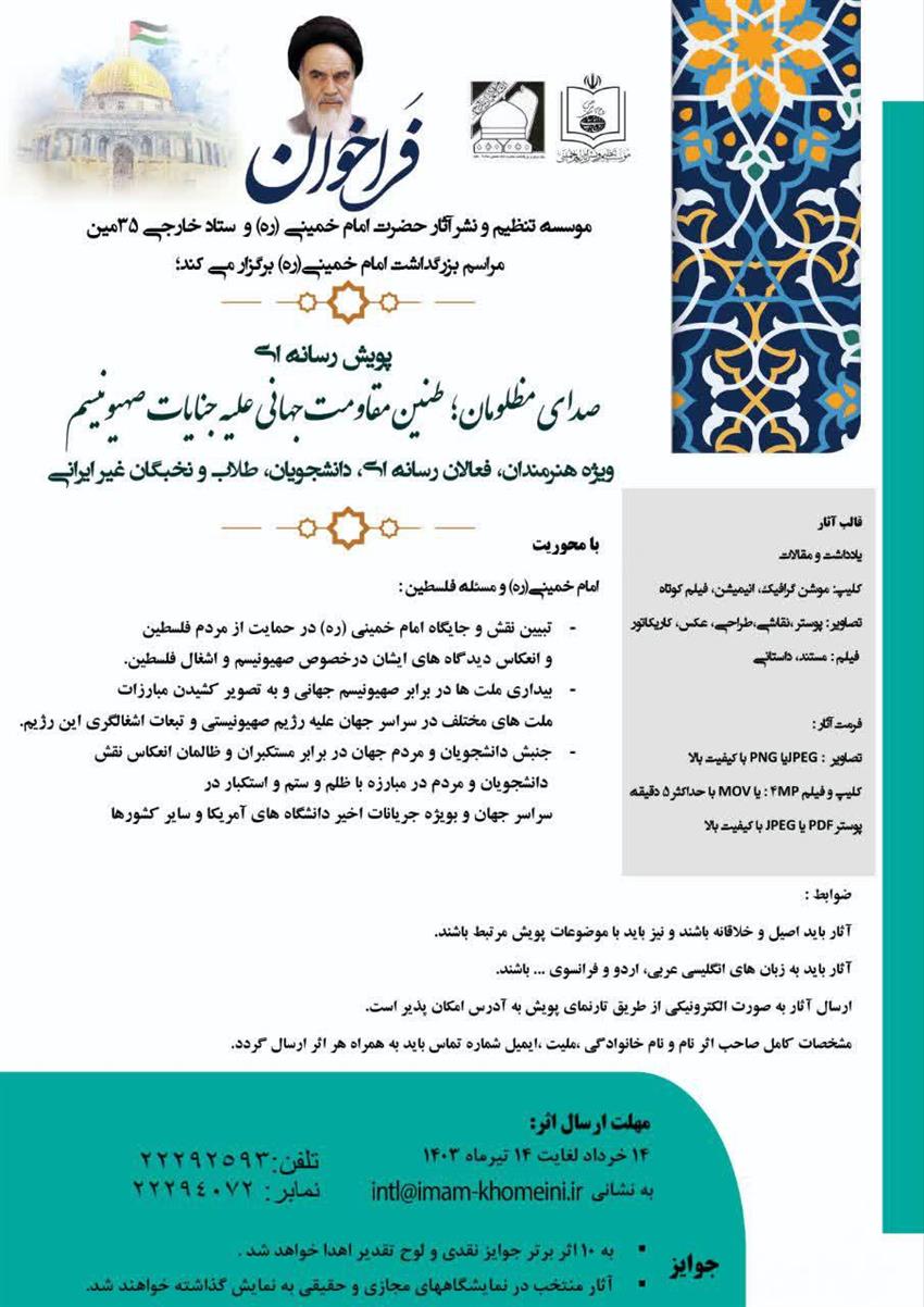 فراخوان پویش رسانه ای "صدای مظلومان، طنین مقاومت جهانی علیه جنایات صهیونیسم" و همچنین مسابقه "دلنوشته و نجواهای شما با امام خمینی (ره) " توسط موسسه تنظیم و نشر آثار حضرت امام خمینی (ره)،