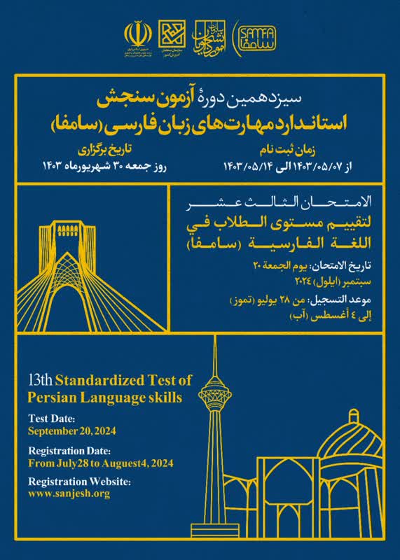 وزارت علوم، تحقیقات و فناوری جمهوری اسلامی ایران سیزدهمین دوره آزمون سنجش استاندارد مهارتهای زبان فارسی (سامفا) را از 30 شهریور 1403 برابر با 20 دسامبر 2024 برگزار می‌کند.