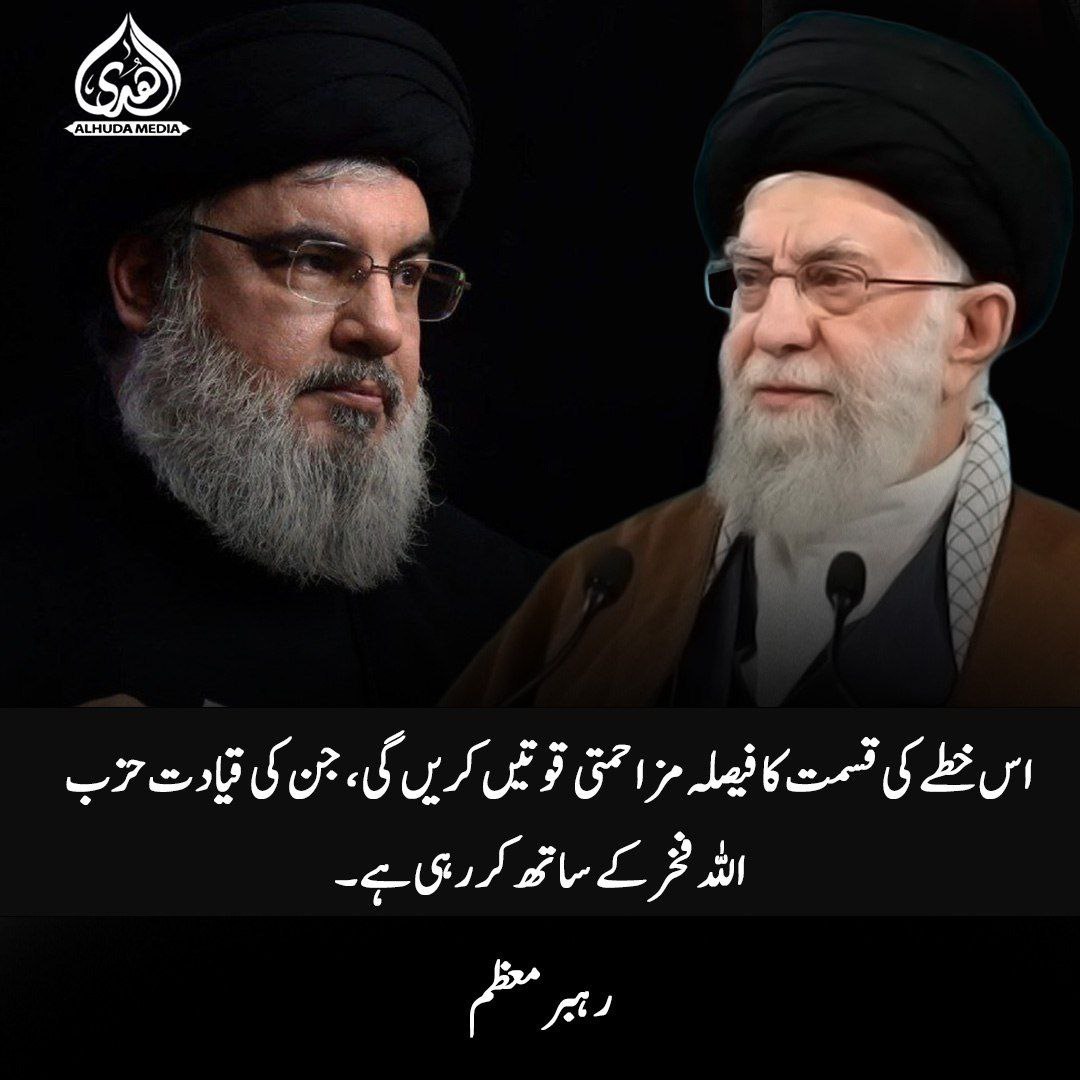 اینجانب به پدر بزرگوار و همسر گرامیِ سید عزیز که پیش از او فرزندش سید هادی را نیز در راه خدا داده، و به فرزندان گرامیش و به خانواده‌های شهیدان این حادثه و به یکایک افراد حزب الله و به مردم عزیز و مقامات عالیه‌ی لبنان، و به سراسر جبهه‌ی مقاومت، و به مجموع امت اسلامی، شهادت نصراالله بزرگ و یاران شهیدش را تبریک و تسلیت عرض میکنم و در ایران اسلامی‌پنج روز عزای عمومی اعلام مینمایم. خداوند آنان را با اولیائش محشور فرماید.
